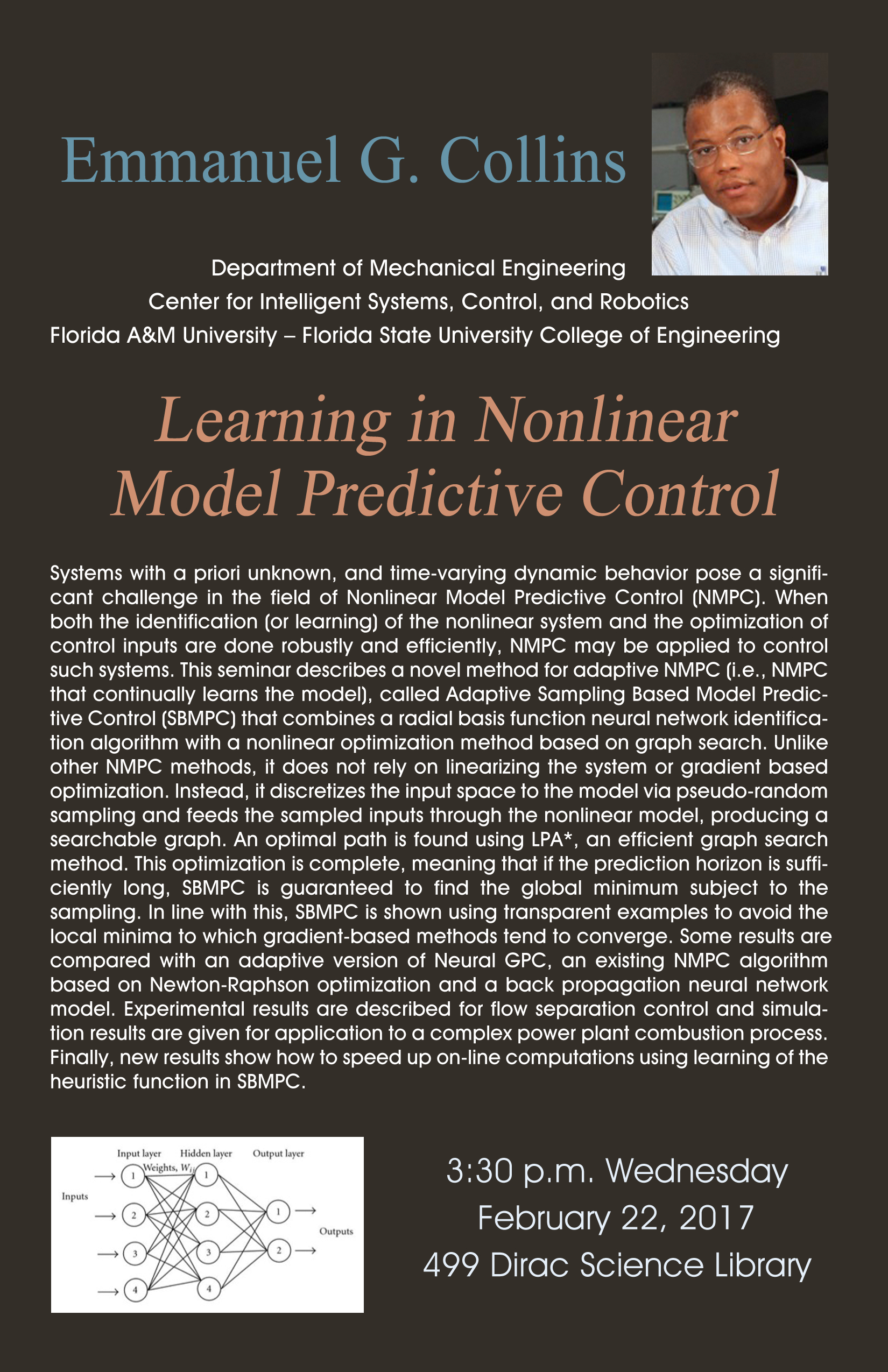 Systems with a priori unknown, and time-varying dynamic behavior pose a significant challenge in the field of Nonlinear Model Predictive Control (NMPC). When both the identification (or learning) of the nonlinear system and the optimization of control inputs are done robustly and efficiently, NMPC may be applied to control such systems. This seminar describes a novel method for adaptive NMPC (i.e., NMPC that continually learns the model), called Adaptive Sampling Based Model Predictive Control (SBMPC) that combines a radial basis function neural network identification algorithm with a nonlinear optimization method based on graph search. Unlike other NMPC methods, it does not rely on linearizing the system or gradient based optimization. Instead, it discretizes the input space to the model via pseudo-random sampling and feeds the sampled inputs through the nonlinear model, producing a searchable graph. An optimal path is found using LPA*, an efficient graph search method. This optimization is complete, meaning that if the prediction horizon is sufficiently long, SBMPC is guaranteed to find the global minimum subject to the sampling. In line with this, SBMPC is shown using transparent examples to avoid the local minima to which gradient-based methods tend to converge. Some results are compared with an adaptive version of Neural GPC, an existing NMPC algorithm based on Newton-Raphson optimization and a back propagation neural network model. Experimental results are described for flow separation control and simulation results are given for application to a complex power plant combustion process. Finally, new results show how to speed up on-line computations using learning of the heuristic function in SBMPC.