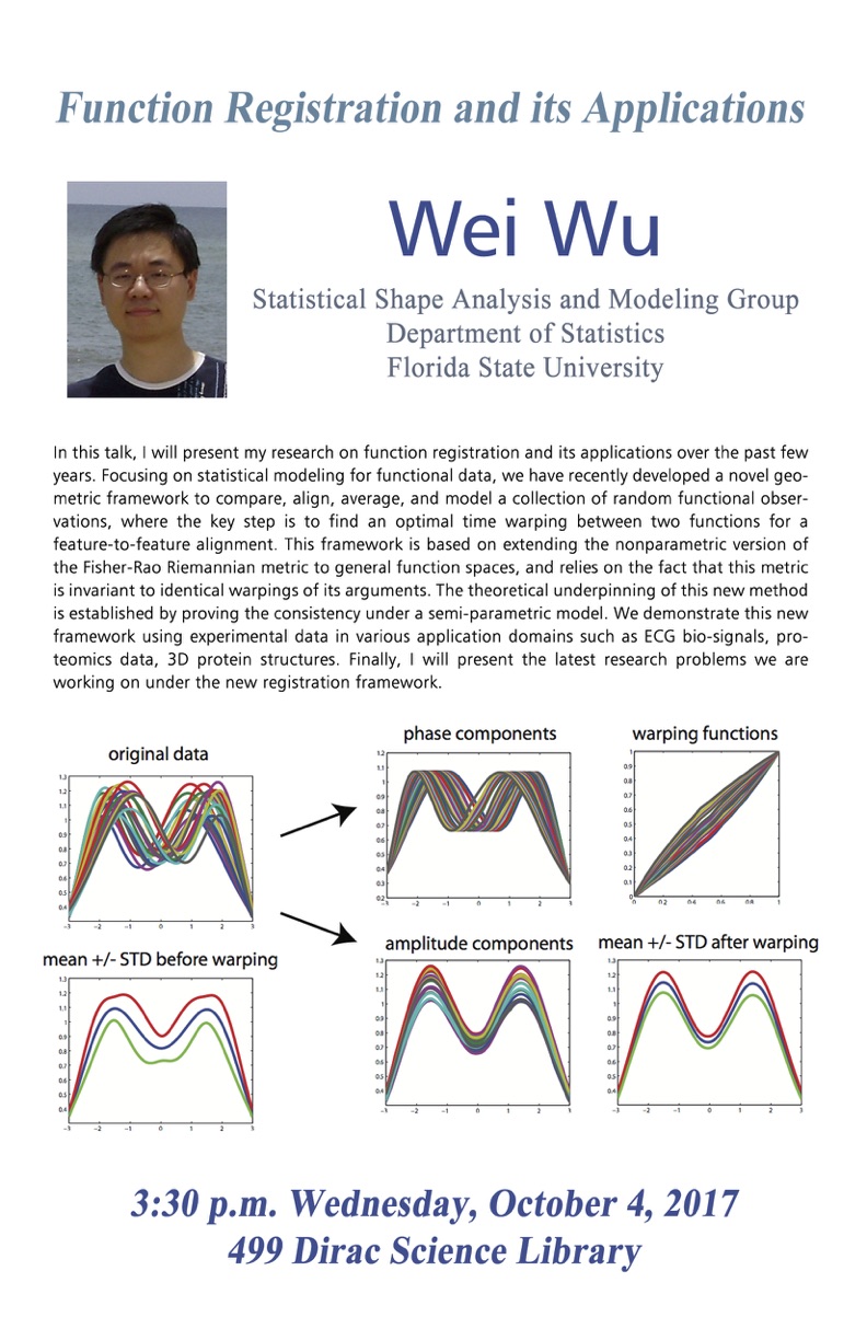 In this talk, I will present my research on function registration and its applications over the past few years. Focusing on statistical modeling for functional data, we have recently developed a novel geometric framework to compare, align, average, and model a collection of random functional observations, where the key step is to find an optimal time warping between two functions for a feature-to-feature alignment. This framework is based on extending the nonparametric version of the Fisher-Rao Riemannian metric to general function spaces, and relies on the fact that this metric is invariant to identical warpings of its arguments. The theoretical underpinning of this new method is established by proving the consistency under a semi-parametric model. We demonstrate this new framework using experimental data in various application domains such as ECG bio-signals, proteomics data, 3D protein structures. Finally, I will present the latest research problems we are working on under the new registration framework.