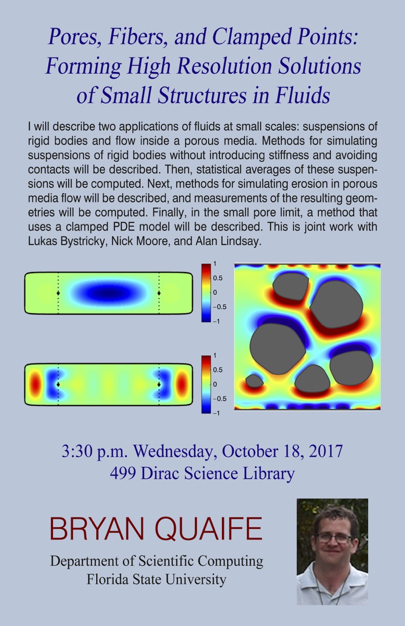 I will describe two applications of fluids at small scales: suspensions of rigid bodies and flow inside a porous media. Methods for simulating suspensions of rigid bodies without introducing stiffness and avoiding contacts will be described. Then, statistical averages of these suspensions will be computed. Next, methods for simulating erosion in porous media flow will be described, and measurements of the resulting geometries will be computed. Finally, in the small pore limit, a method that uses a clamped PDE model will be described. This is joint work with Lukas Bystricky, Nick Moore, and Alan Lindsay.