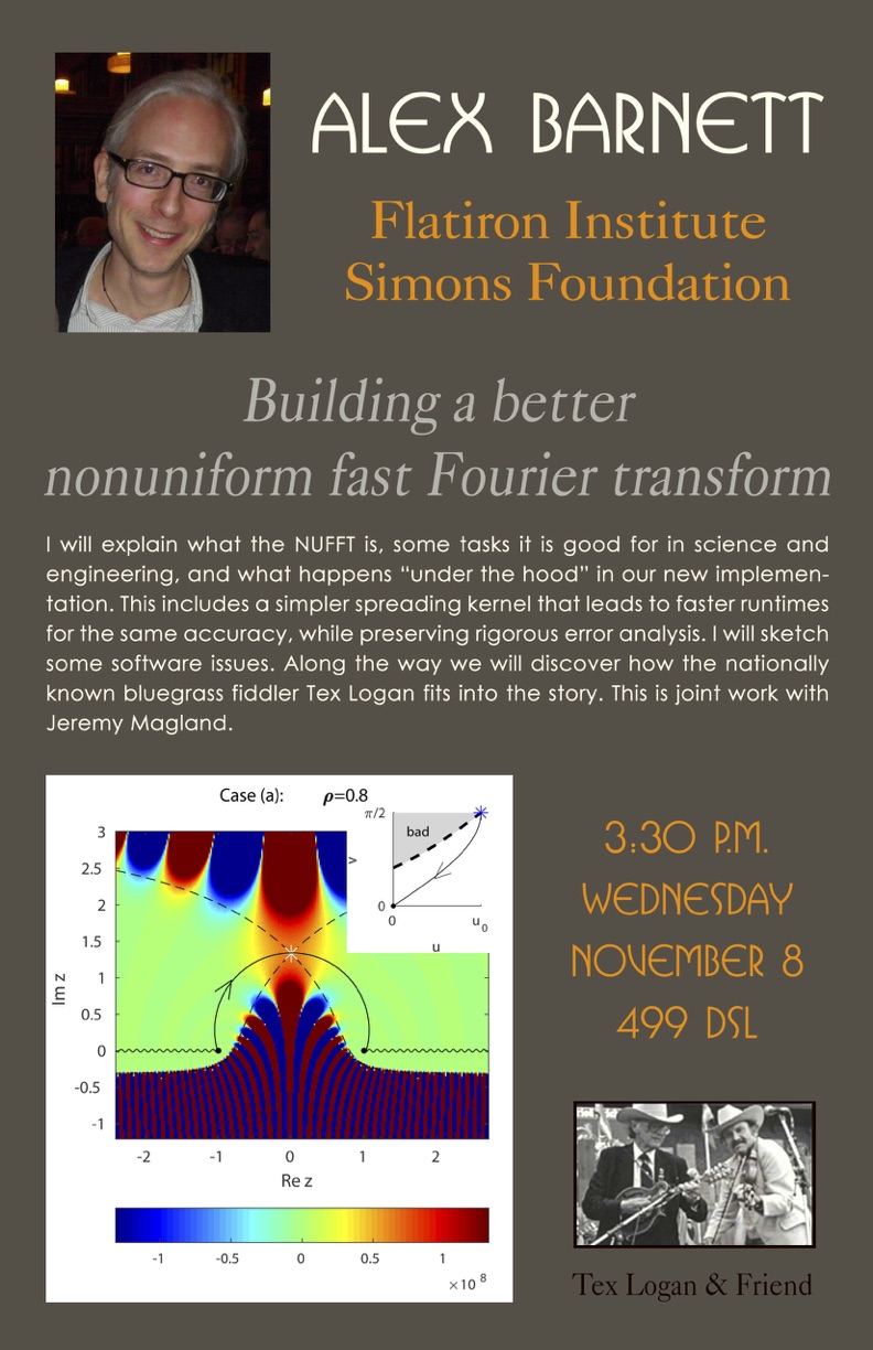 I will explain what the NUFFT is, some tasks it is good for in science and engineering, and what happens "under the hood" in our new implementation. This includes a simpler spreading kernel that leads to faster runtimes for the same accuracy, while preserving rigorous error analysis. I will sketch some software issues. Along the way we will discover how the nationally known bluegrass fiddler Tex Logan fits into the story. This is joint work with Jeremy Magland.