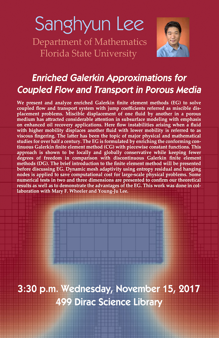 We present and analyze enriched Galerkin finite element methods (EG) to solve coupled flow and transport system with jump coefficients referred as miscible displacement problems. Miscible displacement of one fluid by another in a porous medium has attracted considerable attention in subsurface modeling with emphasis on enhanced oil recovery applications. Here flow instabilities arising when a fluid with higher mobility displaces another fluid with lower mobility is referred to as viscous fingering. The latter has been the topic of major physical and mathematical studies for over half a century. The EG is formulated by enriching the conforming continuous Galerkin finite element method (CG) with piecewise constant functions. This approach is shown to be locally and globally conservative while keeping fewer degrees of freedom in comparison with discontinuous Galerkin finite element methods (DG). The brief introduction to the finite element method will be presented before discussing EG. Dynamic mesh adaptivity using entropy residual and hanging nodes is applied to save computational cost for large-scale physical problems. Some numerical tests in two and three dimensions are presented to confirm our theoretical results as well as to demonstrate the advantages of the EG. This work was done in collaboration with Mary F. Wheeler and Young-Ju Lee.