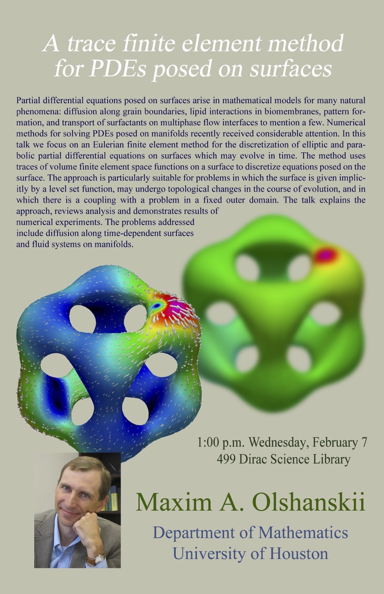 Partial differential equations posed on surfaces arise in mathematical models for many natural phenomena: diffusion along grain boundaries, lipid interactions in biomembranes, pattern formation, and transport of surfactants on multiphase flow interfaces to mention a few. Numerical methods for solving PDEs posed on manifolds recently received considerable attention. In this talk we focus on an Eulerian finite element method for the discretization of elliptic and parabolic partial differential equations on surfaces which may evolve in time. The method uses traces of volume finite element space functions on a surface to discretize equations posed on the surface. The approach is particularly suitable for problems in which the surface is given implicitly by a level set function, may undergo topological changes in the course of evolution, and in which there is a coupling with a problem in a fixed outer domain. The talk explains the approach, reviews analysis and demonstrates results of numerical experiments. The problems addressed include diffusion along time-dependent surfaces and fluid systems on manifolds.