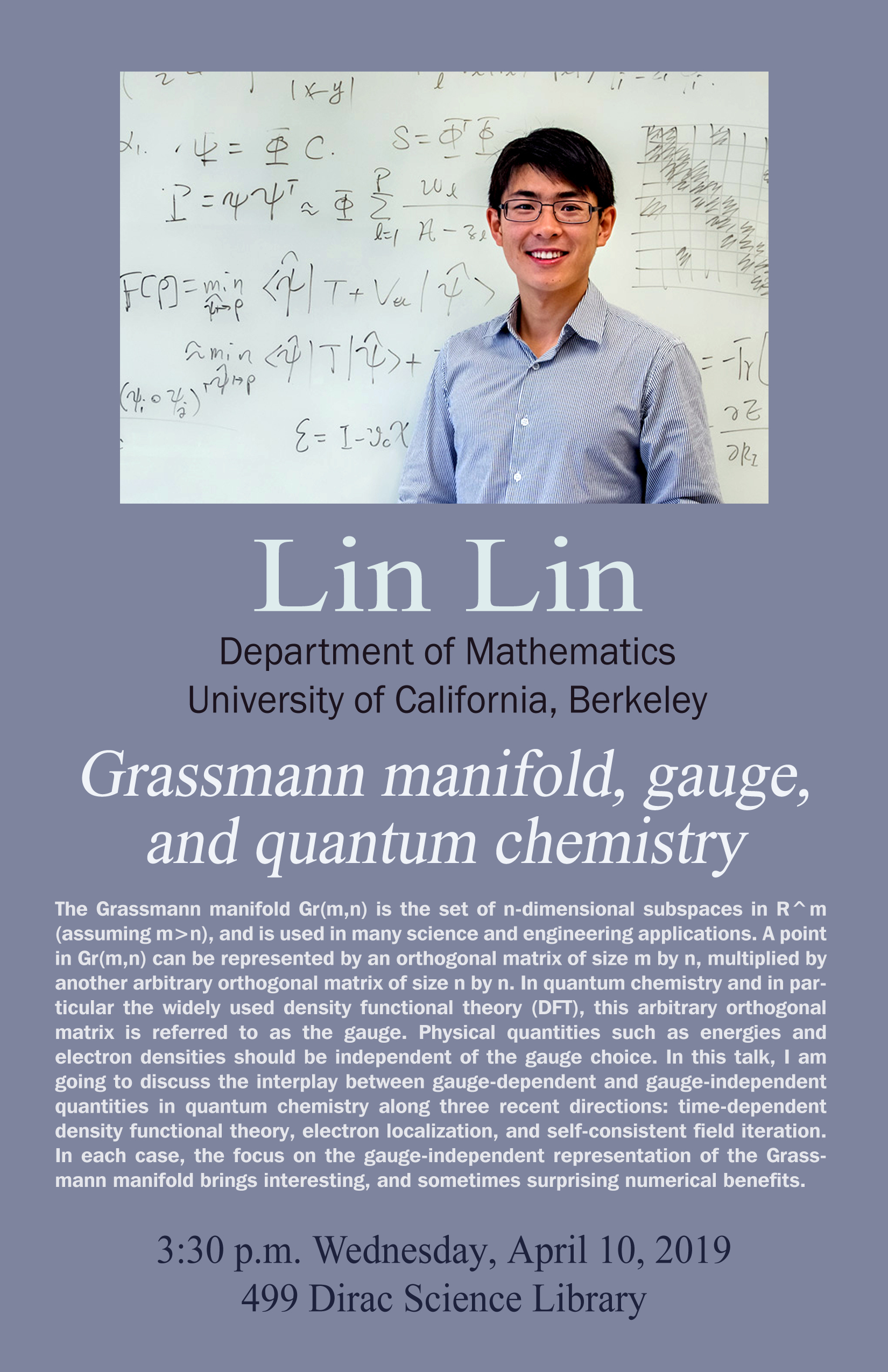 The Grassmann manifold Gr(m,n) is the set of n-dimensional subspaces in R^m (assuming m>n), and is used in many science and engineering applications. A point in Gr(m,n) can be represented by an orthogonal matrix of size m by n, multiplied by another arbitrary orthogonal matrix of size n by n. In quantum chemistry and in particular the widely used density functional theory (DFT), this arbitrary orthogonal matrix is referred to as the gauge. Physical quantities such as energies and electron densities should be independent of the gauge choice. In this talk, I am going to discuss the interplay between gauge-dependent and gauge-independent quantities in quantum chemistry along three recent directions: time-dependent density functional theory, electron localization, and self-consistent field iteration. In each case, the focus on the gauge-independent representation of the Grassmann manifold brings interesting, and sometimes surprising numerical benefits.