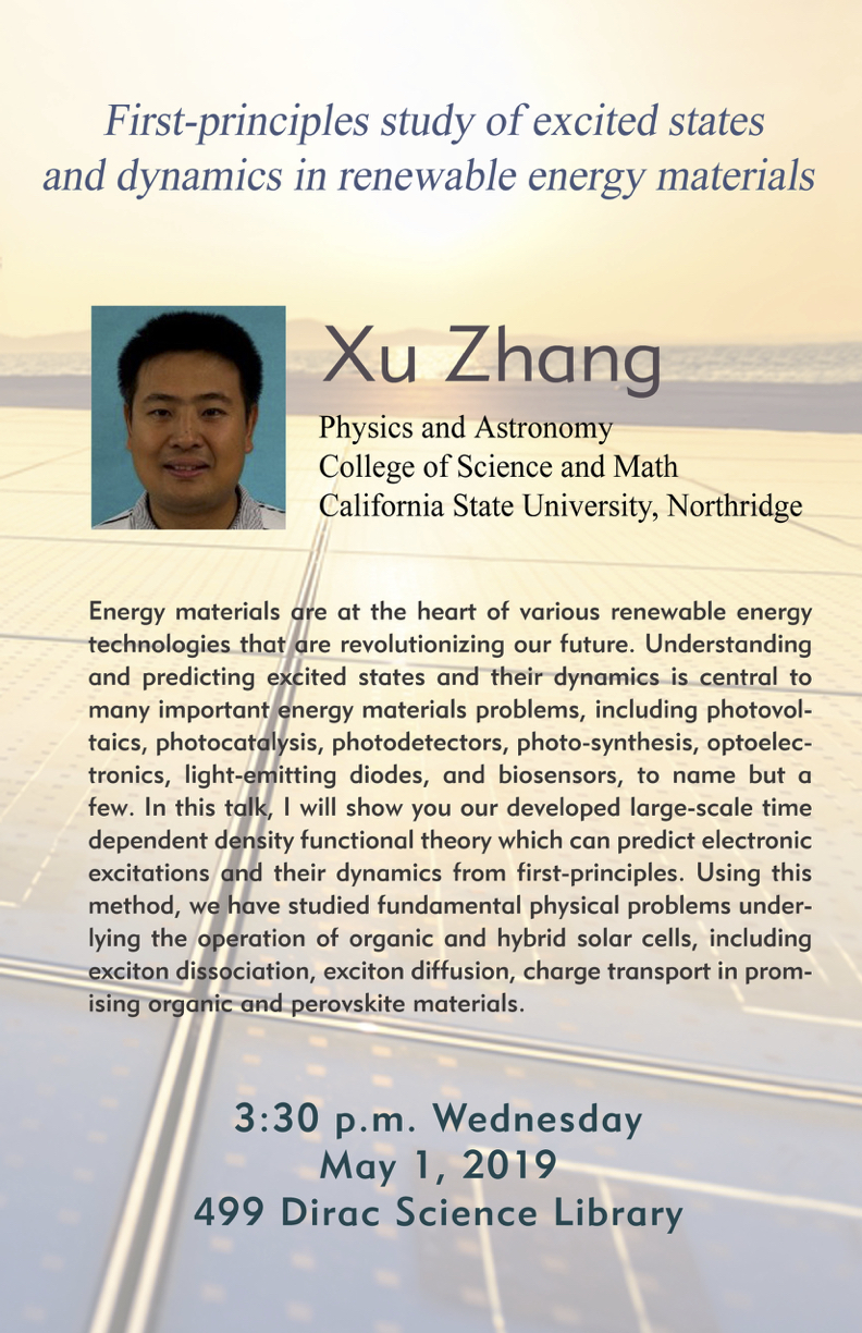 Energy materials are at the heart of various renewable energy technologies that are revolutionizing our future. Understanding and predicting excited states and their dynamics is central to many important energy materials problems, including photovoltaics, photocatalysis, photodetectors, photo-synthesis, optoelectronics, light-emitting diodes, and biosensors, to name but a few. In this talk, I will show you our developed large-scale time dependent density functional theory which can predict electronic excitations and their dynamics from first-principles. Using this method, we have studied fundamental physical problems underlying the operation of organic and hybrid solar cells, including exciton dissociation, exciton diffusion, charge transport in promising organic and perovskite materials.