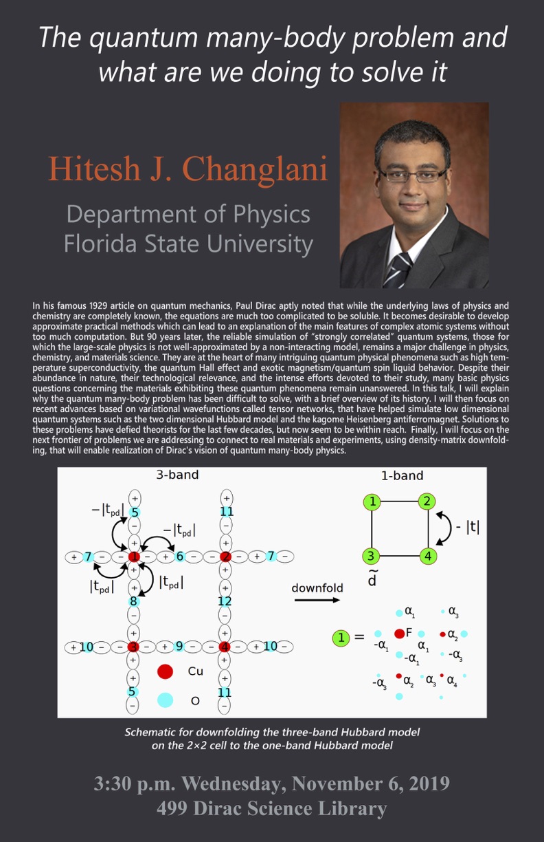In his famous 1929 article on quantum mechanics, Paul Dirac aptly noted that while the underlying laws of physics and chemistry are completely known, the equations are much too complicated to be soluble. It becomes desirable to develop approximate practical methods which can lead to an explanation of the main features of complex atomic systems without too much computation. But 90 years later, the reliable simulation of “strongly correlated” quantum systems, those for which the large-scale physics is not well-approximated by a non-interacting model, remains a major challenge in physics, chemistry, and materials science. They are at the heart of many intriguing quantum physical phenomena such as high temperature superconductivity, the quantum Hall effect and exotic magnetism/quantum spin liquid behavior. Despite their abundance in nature, their technological relevance, and the intense efforts devoted to their study, many basic physics questions concerning the materials exhibiting these quantum phenomena remain unanswered. In this talk, I will explain why the quantum many-body problem has been difficult to solve, with a brief overview of its history. I will then focus on recent advances based on variational wavefunctions called tensor networks, that have helped simulate low dimensional quantum systems such as the two dimensional Hubbard model and the kagome Heisenberg antiferromagnet. Solutions to these problems have defied theorists for the last few decades, but now seem to be within reach. Finally, I will focus on the next frontier of problems we are addressing to connect to real materials and experiments, using density-matrix downfolding, that will enable realization of Dirac's vision of quantum many-body physics.
