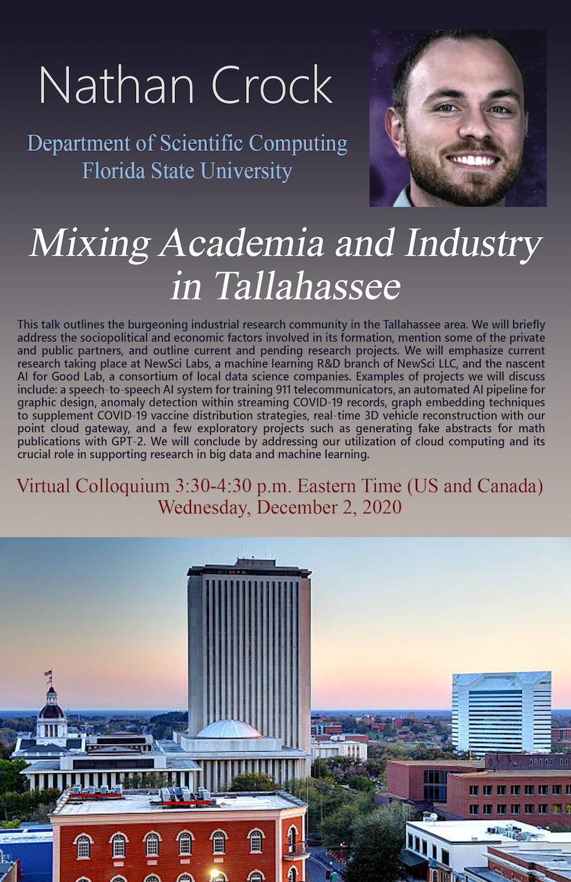 This talk outlines the burgeoning industrial research community in the Tallahassee area. We will briefly address the sociopolitical and economic factors involved in its formation, mention some of the private and public partners, and outline current and pending research projects. We will emphasize current research taking place at NewSci Labs, a machine learning R&D branch of NewSci LLC, and the nascent AI for Good Lab, a consortium of local data science companies. Examples of projects we will discuss include: a speech-to-speech AI system for training 911 telecommunicators, an automated AI pipeline for graphic design, anomaly detection within streaming COVID-19 records , graph embedding techniques to supplement COVID-19 vaccine distribution strategies, real-time 3D vehicle reconstruction with our point cloud gateway, and a few exploratory projects such as generating fake abstracts for math publications with GPT-2. We will conclude by addressing our utilization of cloud computing and its crucial role in supporting research in big data and machine learning.