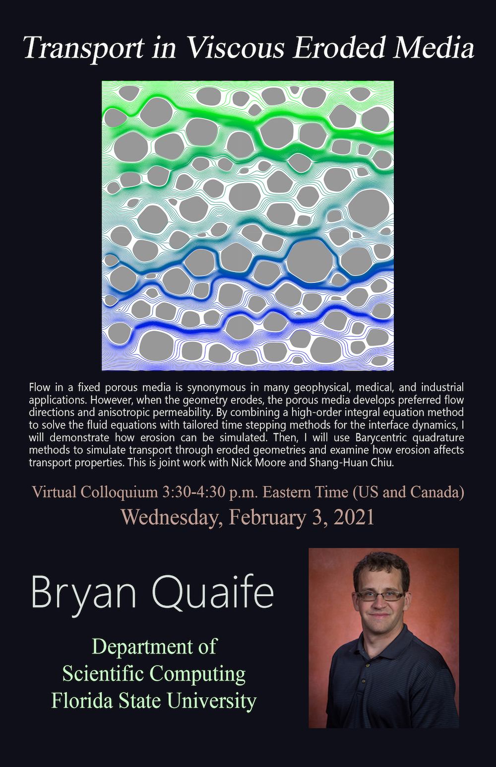 Flow in a fixed porous media is synonymous in many geophysical, medical, and industrial applications. However, when the geometry erodes, the porous media develops preferred flow directions and anisotropic permeability. By combining a high-order integral equation method to solve the fluid equations with tailored time stepping methods for the interface dynamics, I will demonstrate how erosion can be simulated. Then, I will use Barycentric quadrature methods to simulate transport through eroded geometries and examine how erosion affects transport properties. This is joint work with Nick Moore and Shang-Huan Chiu.