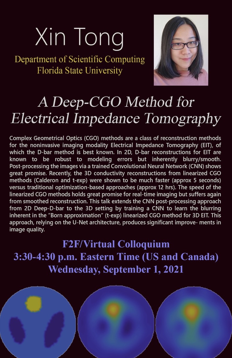 Complex Geometrical Optics (CGO) methods are a class of reconstruction methods for the noninvasive imaging modality Electrical Impedance Tomography (EIT), of which the D-bar method is best known. In 2D, D-bar reconstructions for EIT are known to be robust to modeling errors but inherently blurry/smooth. Post-processing the images via a trained Convolutional Neural Network (CNN) shows great promise. Re- cently, the 3D conductivity reconstructions from linearized CGO methods (Calderon and t-exp) were shown to be much faster (approx 5 seconds) versus traditional optimization-based approaches (approx 12 hrs). The speed of the linearized CGO methods holds great promise for real-time imaging but suffers again from smoothed reconstruction. This talk extends the CNN post-processing approach from 2D Deep-D-bar to the 3D setting by training a CNN to learn the blurring inherent in the “Born approximation” (t-exp) linearized CGO method for 3D EIT. This approach, relying on the U-Net architecture, produces significant improve- ments in image quality.