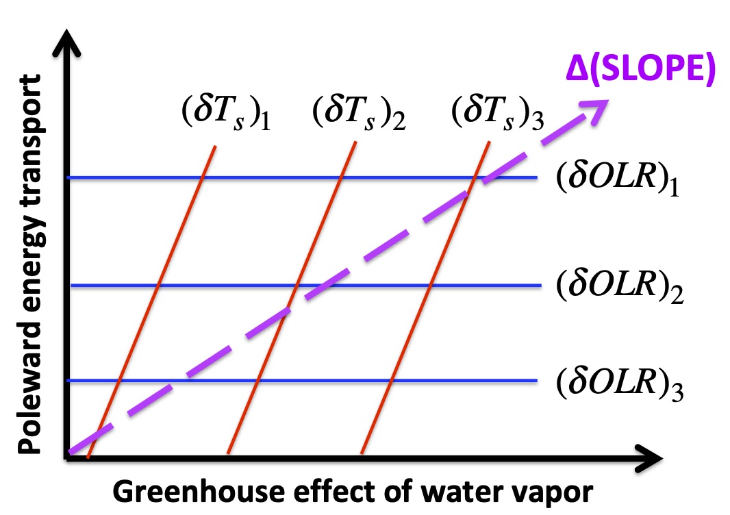 The observed quasi-linear OLR-TS relation manifests a climate footprint of radiative (such as the greenhouse effect) and non-radiative processes (poleward energy transport). The former acts to increase the meridional gradient of surface temperature and the latter decreases the meridional gradient of atmospheric temperatures, causing the flattening of the meridional profile of the OLR. Radiative processes alone can lead to a quasi-linear OLR-TS relation that is more steeply sloped. The atmospheric poleward energy transport alone can also lead to a quasi-linear OLR-TS relation by rerouting part of the OLR to be emitted from a warmer place to a colder place. The combined effects of radiative and non-radiative processes make the quasi-linear OLR-TS relation less sloped with a higher degree of linearity. In response to anthropogenic radiative forcing, the slope of the quasi-linear OLR-TS relation is further reduced via stronger water vapor feedback and enhanced poleward energy transport.