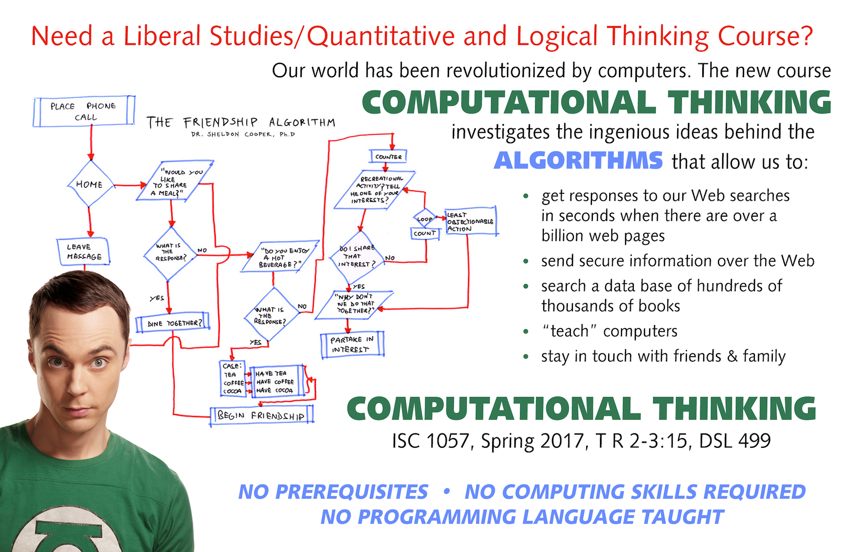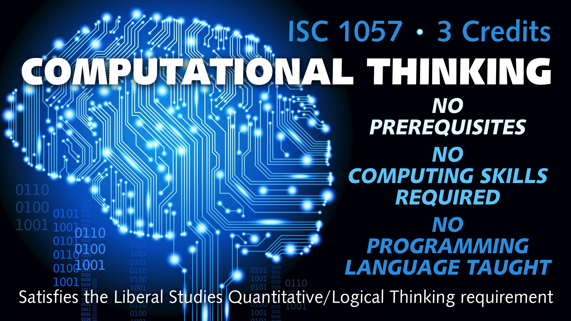 ISC 1057. Computational Thinking (3). This course introduces students to the process of creating a representation of a task so that it can be performed by a computer. The course investigates strategies behind popular computational methods that are shaping our daily lives and our future. Students practice logical thinking by applying versions of these computational methods to problems in science and society.